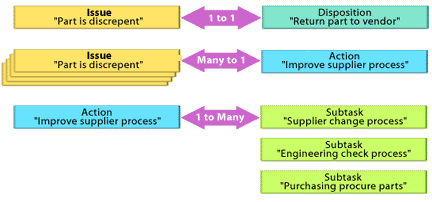In contrast, there is a "many to one" correspondence associated with Problems (Issues) and Solutions (Actions). This means that one or more Problems may be associated with (or assigned to) a single Solution. This makes sense because one solution can apply to or solve many problems. For example, let's say that three problems were logged at different times for a part that doesn't meet a dimension specification. A single solution such as using a substitute part could apply to all three Issues and each would be assigned to this Action.